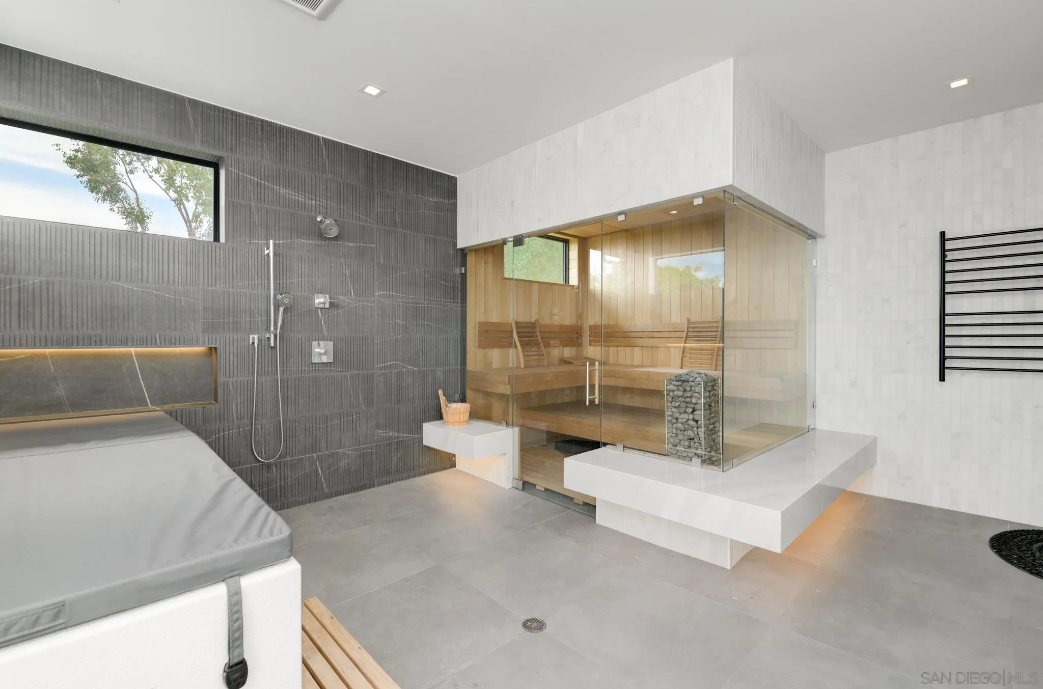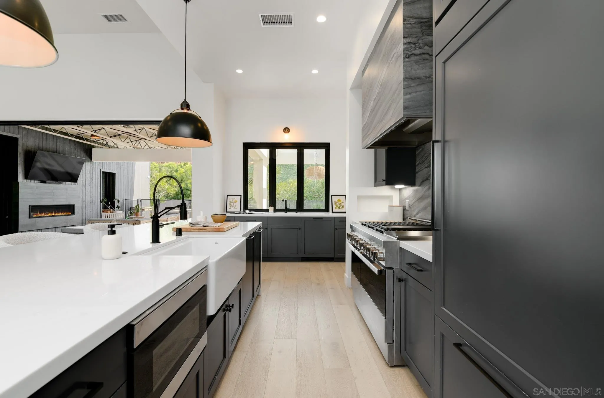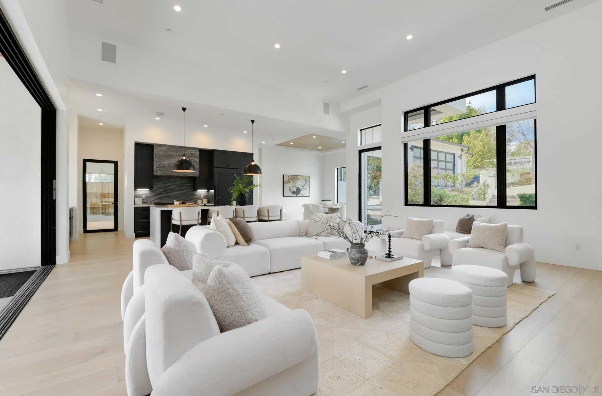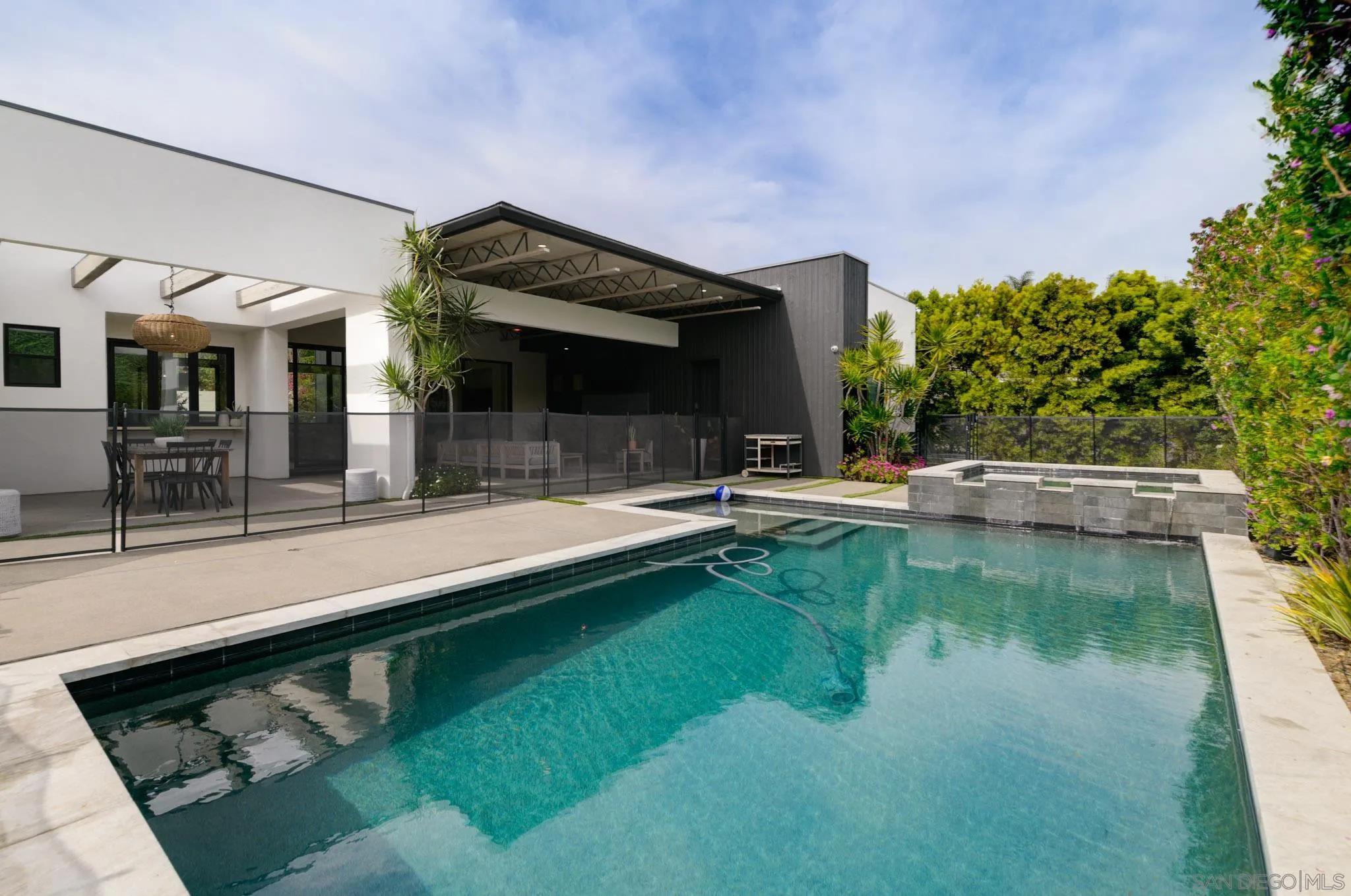 A 2020-built modern farmhouse in sought-after West Olivenhain, this custom estate blends industrial-inspired architecture with refined contemporary design on a large private lot. Designed for seamless single-level living, the home offers 1,150 sq.ft. of covered outdoor space overlooking a resort-style pool and spa. Dramatic ceilings, Fleetwood and LaCantina doors, and premium Marvin windows create effortless indoor-outdoor flow throughout the open-concept living spaces and chef's kitchen. The thoughtful layout features a private primary suite and two bedrooms--including an office with separate entrance--on one wing, with two additional en-suite bedrooms on the opposite side. Resort-style amenities include smart home technology, integrated indoor/outdoor surround sound speakers, EV chargers, an oversized garage, and expansive grounds with an outdoor kitchen, lawn, and space for a garden or orchard. A dedicated wellness retreat features a Hume sauna system, Core Chill Blue Cube cold plunge, shower, heated towel bar, plus an additional ~150 sq.ft. space with a half bath and outdoor shower. Additional upgrades include InfraTech outdoor heaters, additional solar panels, solar tubing for the saltwater pool, whole-home water filtration, and security cameras--all controllable from your phone. The home also offers new custom primary closets and electric blinds throughout, completing this exceptional modern coastal retreat.