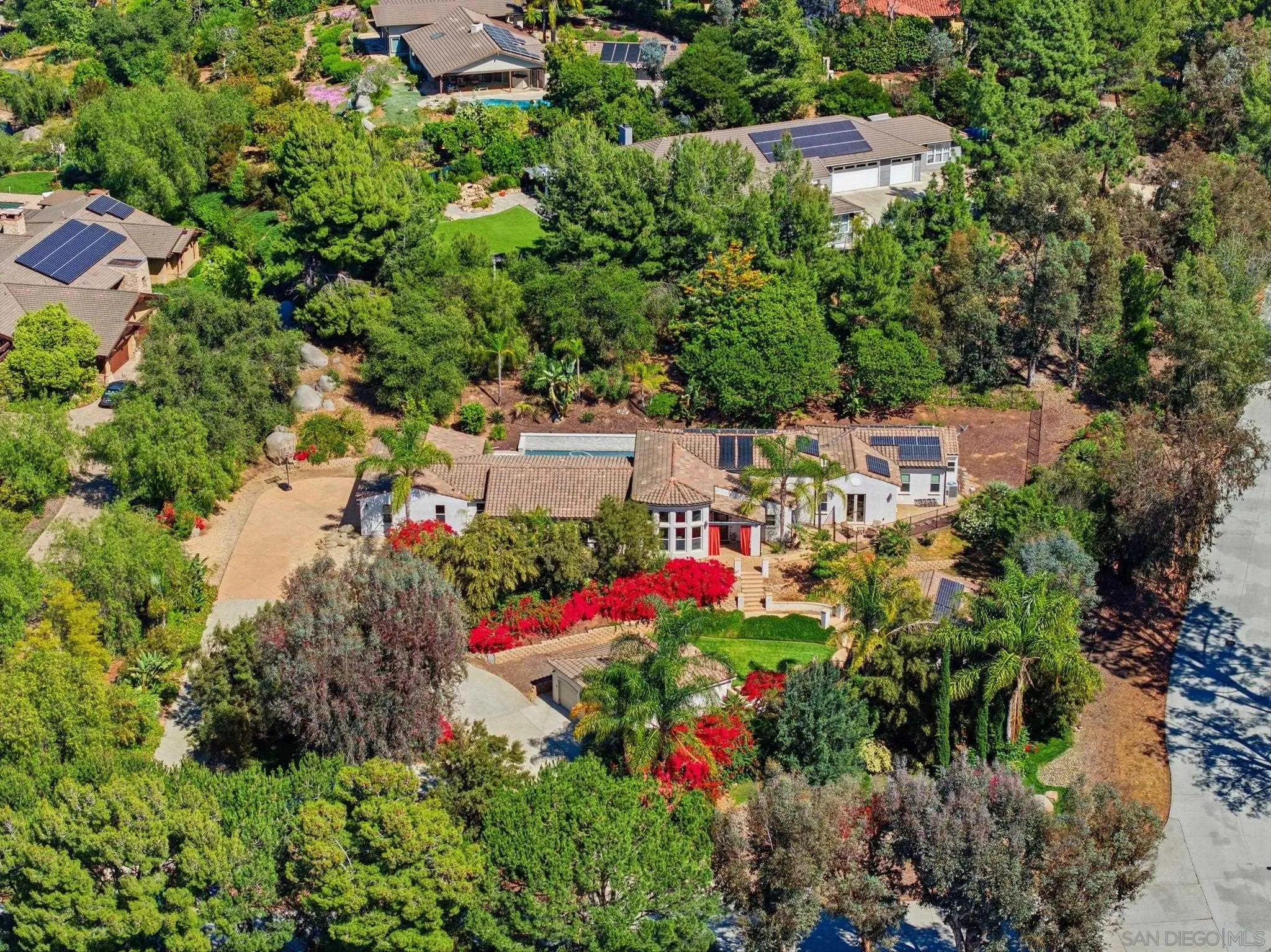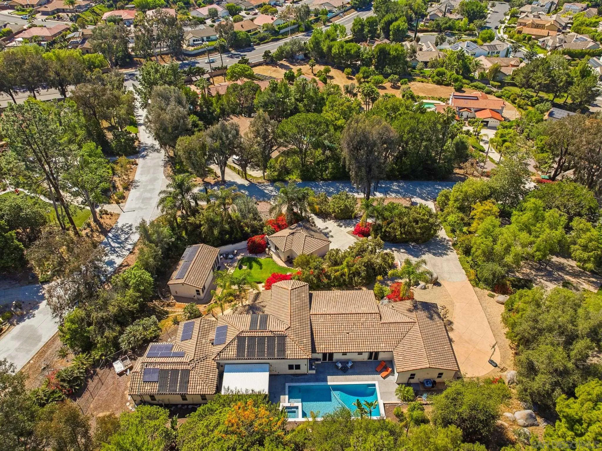 Nestled on a serene one-acre corner lot in the prestigious Trails of Rancho Bernardo, this custom single-story home offers resort-style living at its finest. Classic and timeless in design, the 2015-built residence delivers exceptional multi-generational versatility through a private detached casita (ADU), generous living spaces, and a backyard oasis built for year-round enjoyment. Inside, soaring ceilings flood the home with light and enhance the flow between living spaces. The heart of the home, the chef's kitchen, overlooks the pool and is appointed for both daily living and entertaining, featuring an oversized island with seating, dining nook, wine fridge, and premium Thermador appliances including a built-in refrigerator, 6-burner range with griddle, and double ovens. The formal dining room, currently styled as a game room with billiards, speaks to the home's flexibility. Folding glass doors span the great room, creating seamless indoor-outdoor living. The primary suite, privately positioned in its own wing, offers backyard access and a spa-like bath with soaking tub, walk-in shower, dual vanities, and an oversized walk-in closet. Each secondary bedroom is a generous en-suite. A family room with built-ins, spacious laundry room, and dedicated flex space complete the interior. The detached casita (ADU) offers a private bed/bath, kitchenette, and garage on one level. The backyard features a solar-heated pool and spa, convertible patio cover, and mature landscaping. Owned solar and a 3-car garage complete the offering, all within Poway Unified and minutes to I-15.