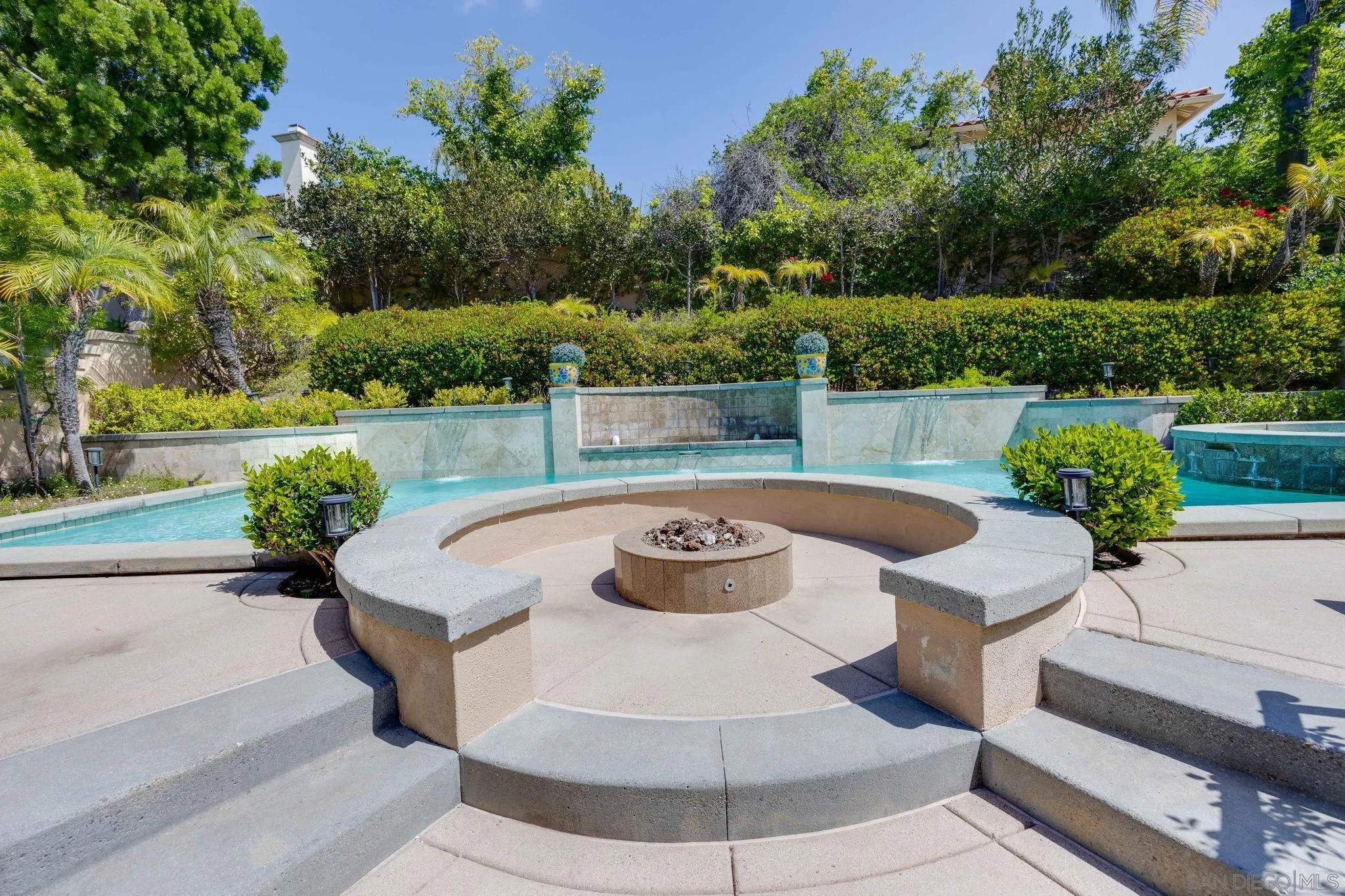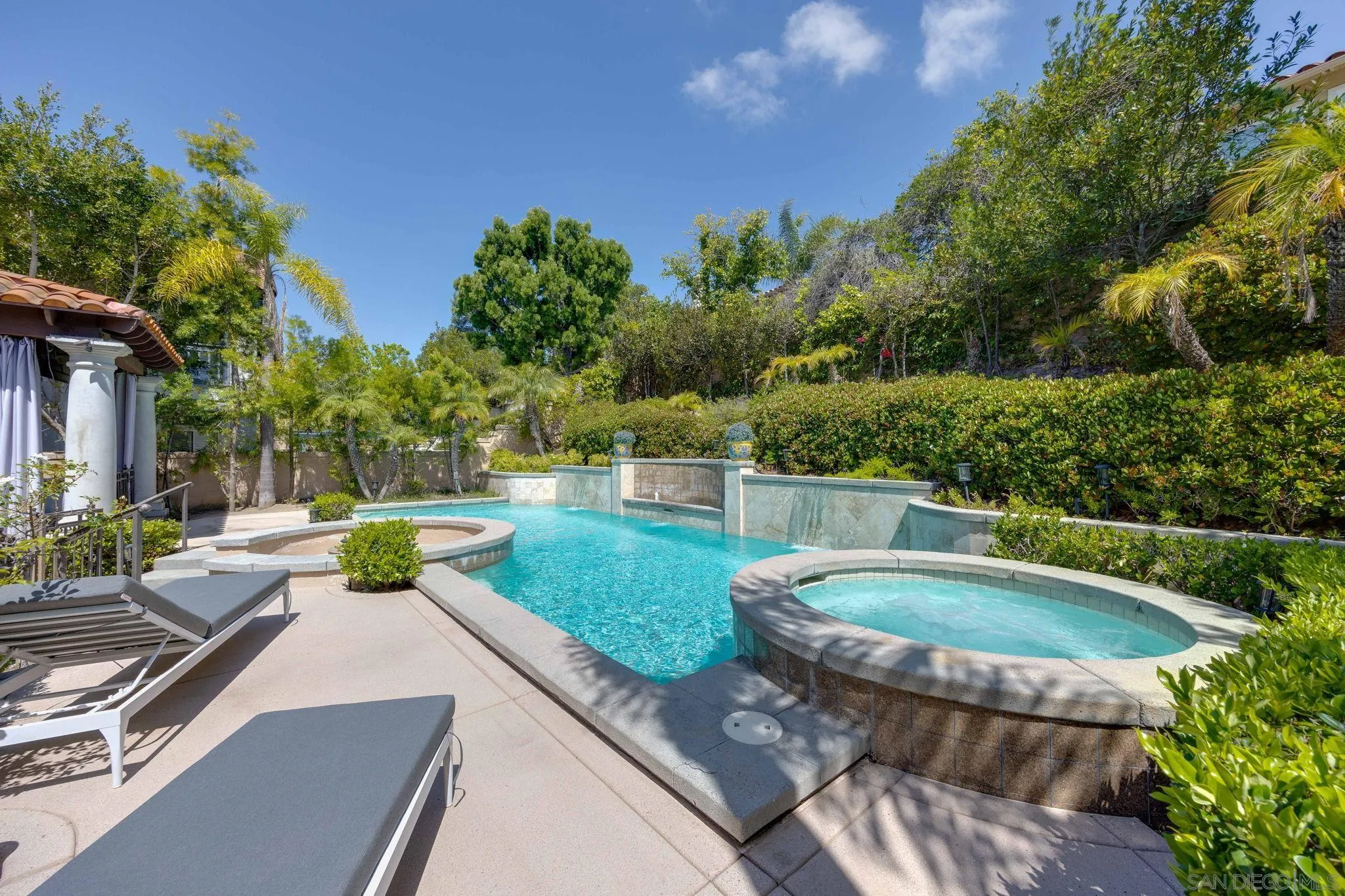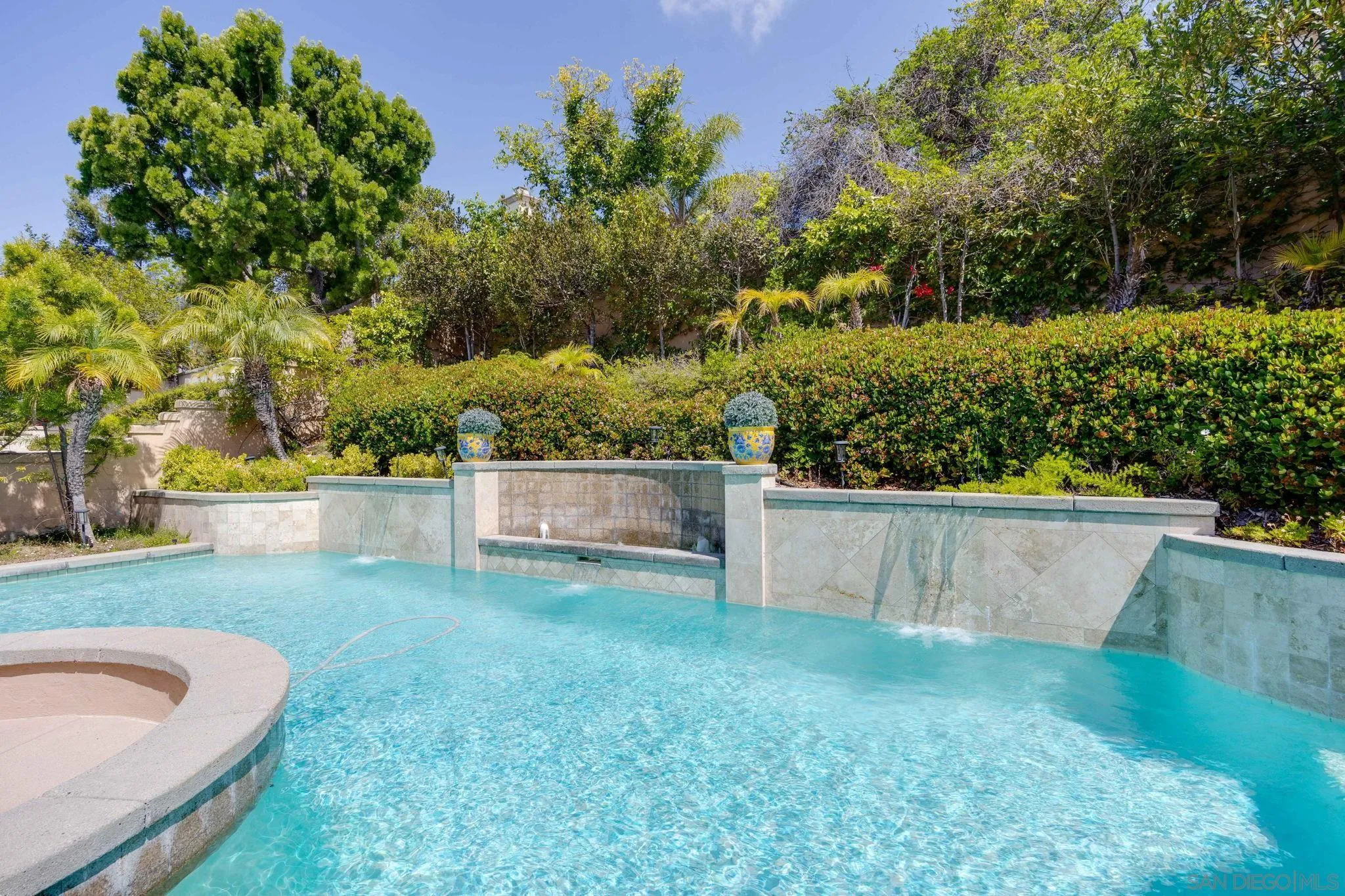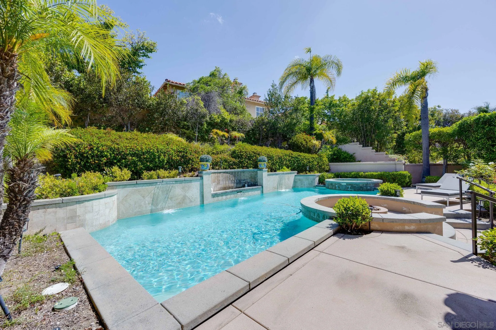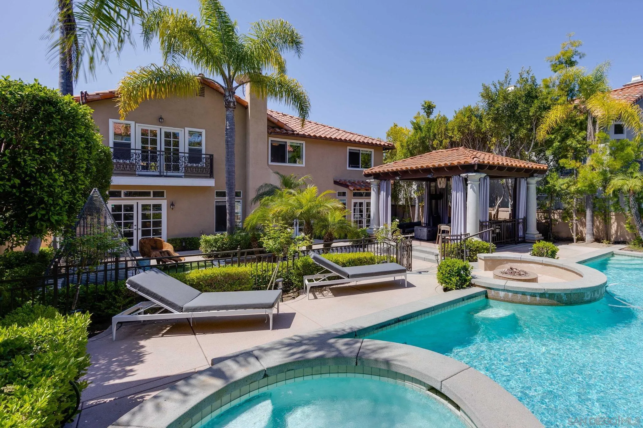 Tucked away on a quiet cul-de-sac in Carmel Valley, this home sits on one of the largest lots in the neighborhood and offers an ideal blend of space, functionality, and lifestyle--just moments from Ashley Falls Elementary School, parks, and greenbelts. When you enter the home, you are greeted by vaulted ceilings and reception space. The open layout features a formal dining & living room. The spacious family room flows seamlessly into the kitchen, complete with stainless steel appliances, a double oven, and ample space for everyday living and entertaining. You'll also find a dedicated office space, a convenient downstairs suite, designated laundry room, and a 3 car garage. Upstairs includes an additional office/media room, two ensuite bedrooms, and a private primary retreat with a balcony overlooking the backyard. The spa-inspired primary bath features a soaking tub, double-sided fireplace, walk-in shower with dual shower-heads, dual vanities, and a custom walk-in closet. Step outside to your own private oasis--designed for year-round enjoyment. The expansive backyard features three outdoor firepits, a built-in barbecue with grill and wine refrigerator, outdoor heaters, multiple lounge areas, and a European-inspired pool and spa with tranquil waterfalls. A custom-built pergola completes the space, creating the ultimate setting for entertaining or relaxing. With no HOA, owned solar, and an unbeatable location, this is a rare opportunity to own a truly special home in one of North County's most sought-after communities. Mello Roos scheduled to end next year!