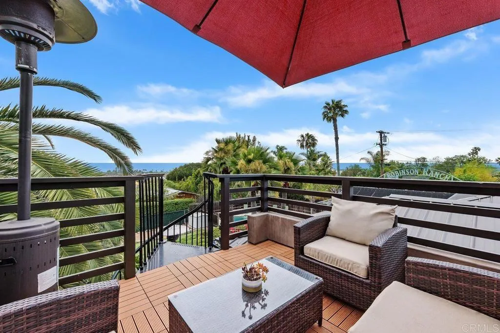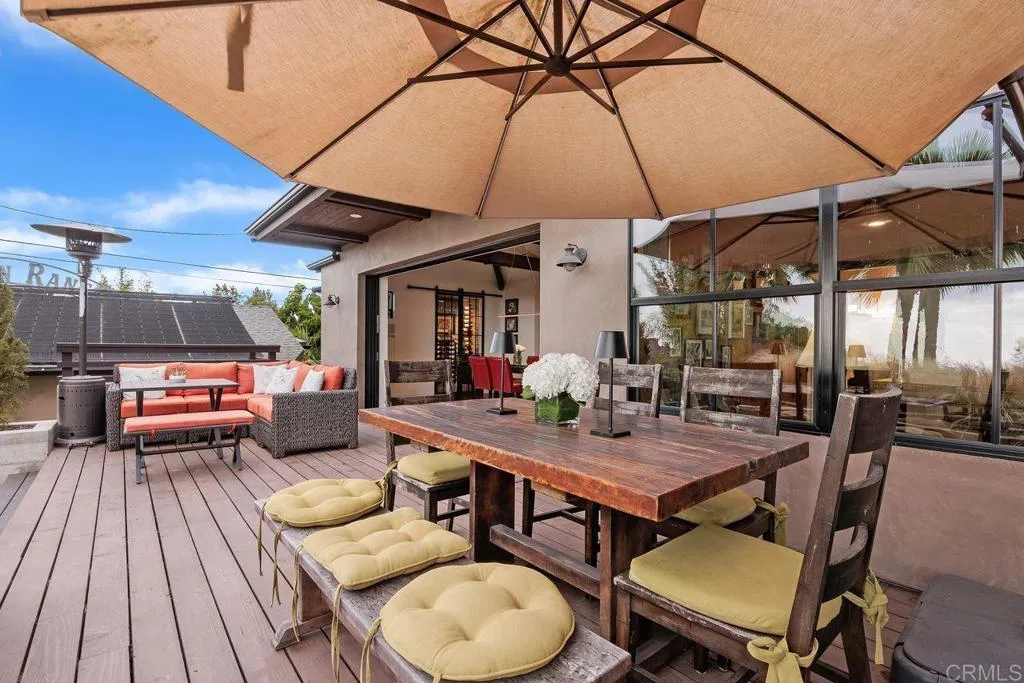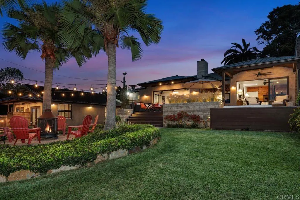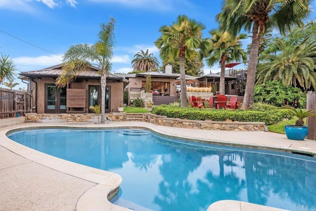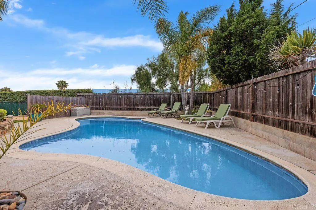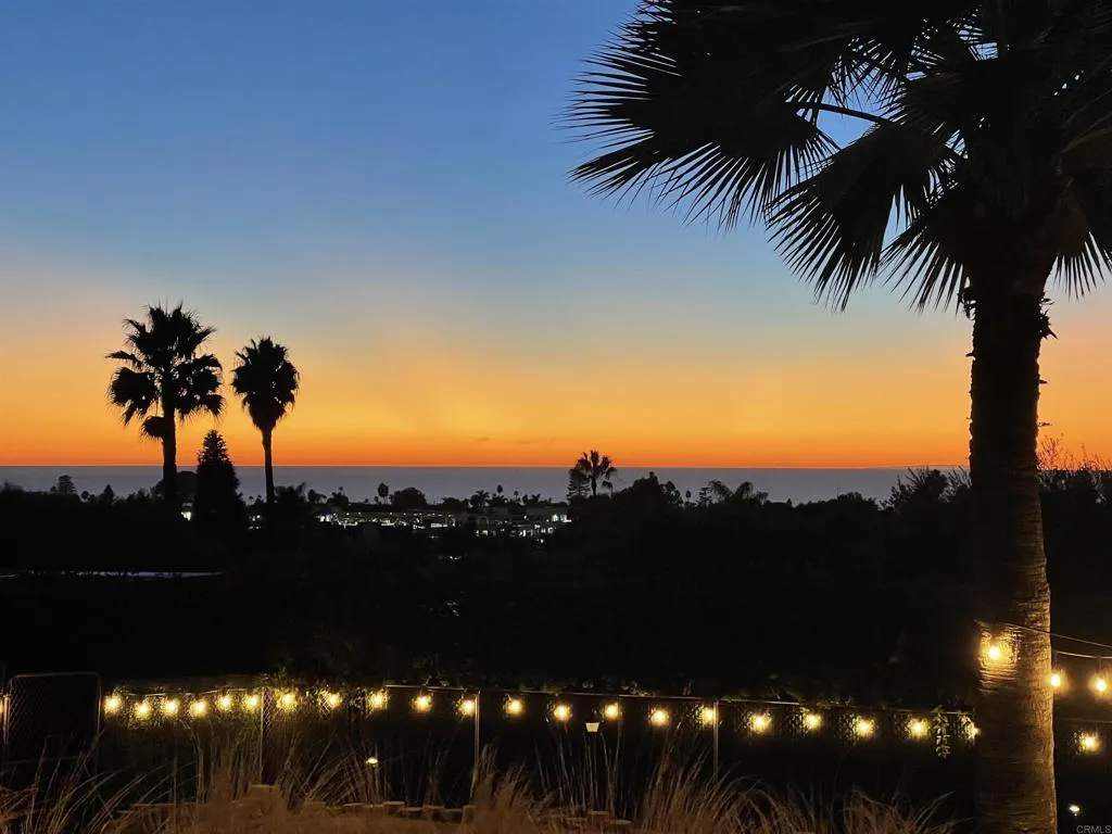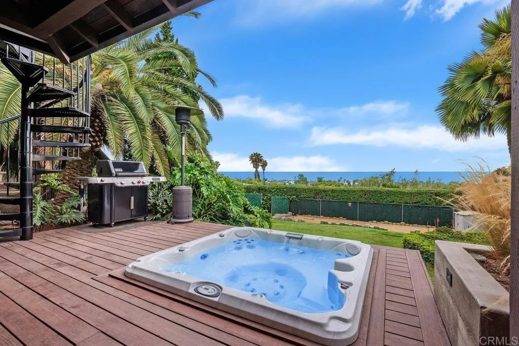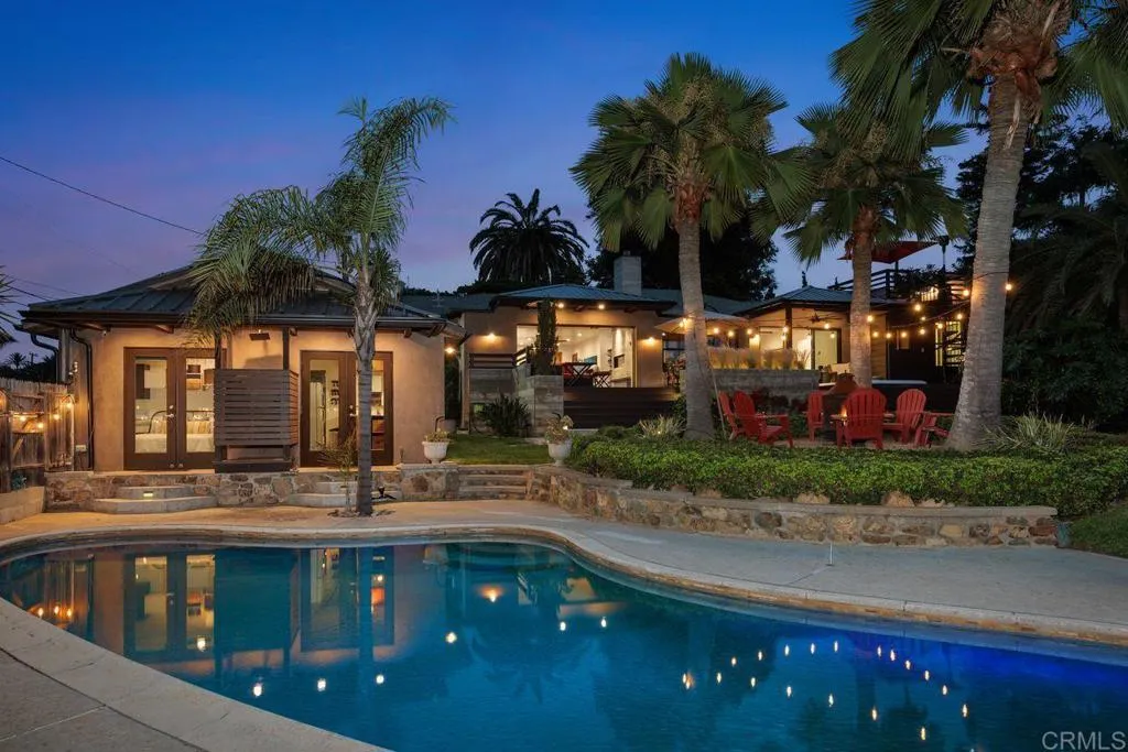 Experience the ultimate in coastal tranquility and privacy at this stunning half-acre gated compound, tucked away on a private easement road in the heart of Old Encinitas. This exceptional property features a beautifully appointed single-level main home with 3 bedrooms and a detached 1-bedroom guest houseperfect for extended family, guests, or a private retreat. The character of the main residence showcases bamboo flooring, a dramatic dining room with vaulted open-beam ceilings, an eye-catching wine vault, a sleek linear gas fireplace, and panoramic ocean views. Pocket doors open seamlessly to a breathtaking ocean view with a sprawling 500-square-foot redwood deck, ideal for entertaining or relaxing, with sweeping views of the manicured lawn, sparkling solar-heated saltwater pool, firepit lounge, bistro lighting, and a Ptanque court for casual outdoor fun. The spacious primary suite is a true sanctuary, offering a massive walk-in closet with custom built-ins and motion-sensor lighting. The spa-inspired bathroom includes a soaking tub with ocean views, vaulted ceilings, and direct access to a private, heated, ocean-view deck with a jacuzzian idyllic spot to unwind. Additional highlights include an additional second-level 100-square-foot deck for watching the sunset while enjoying your beverage of choice. Modern concrete planters anchor the entire house and enhance the homes design and architecture. The detached guest house has a unique character of its own featuring a generous bedroom that opens to the pool, a full kitchen, living area, a dedicated workout room and an outdoo
