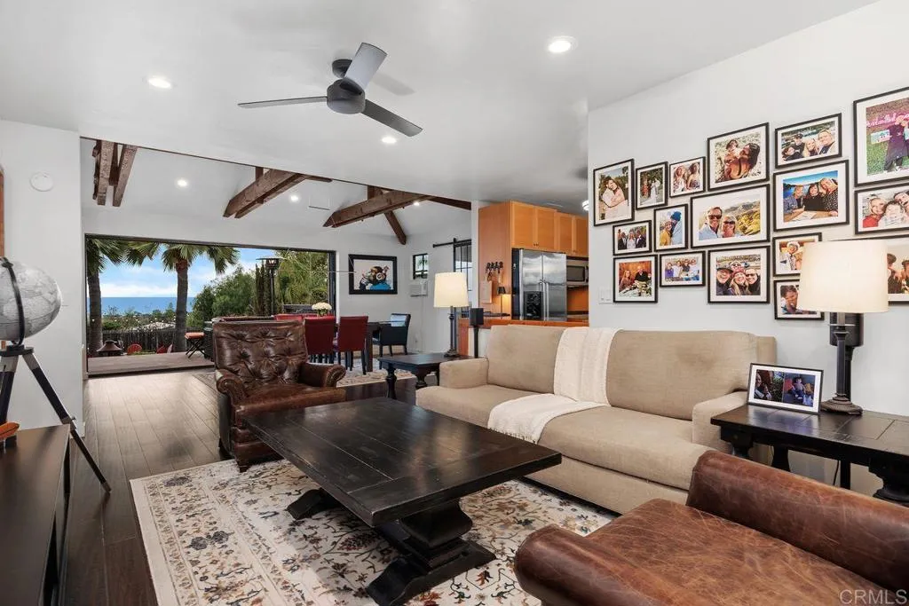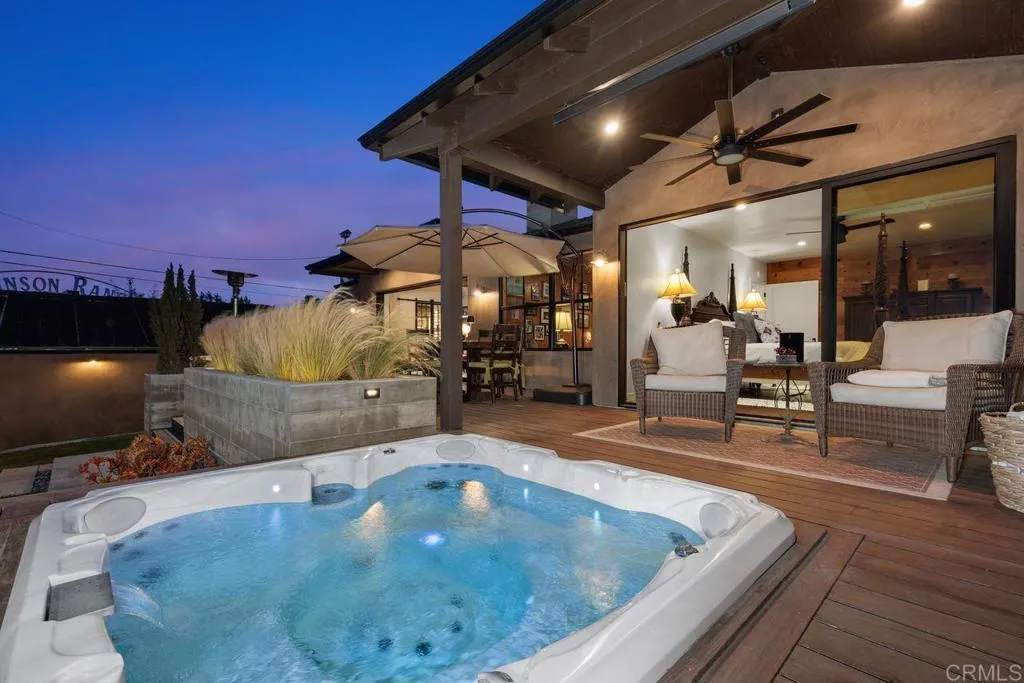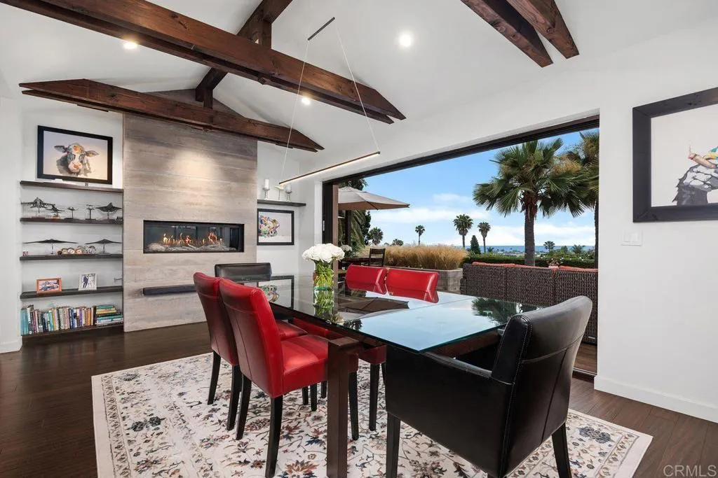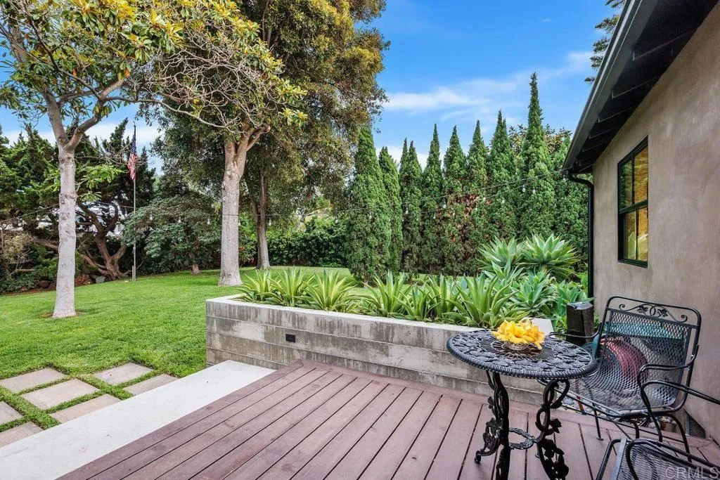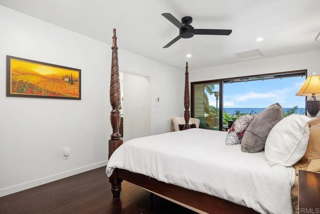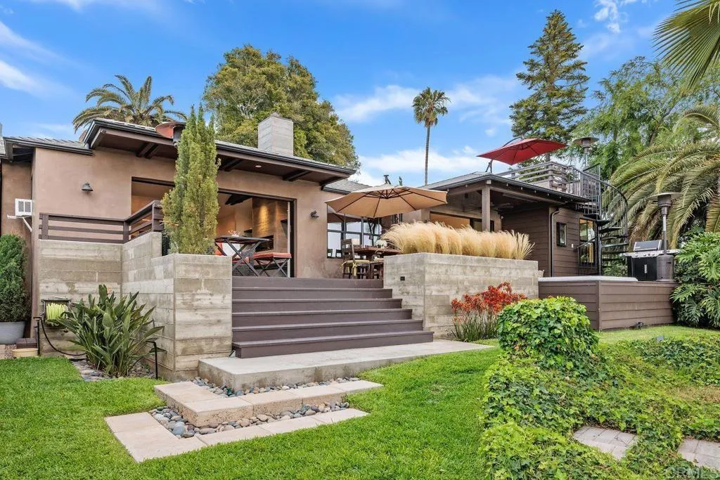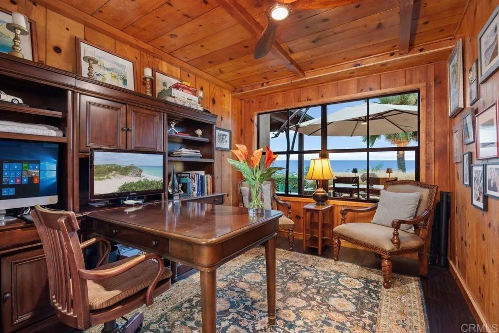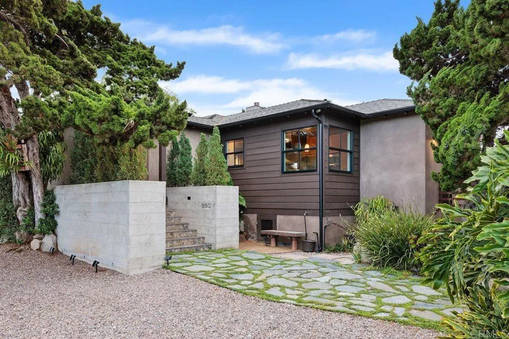 Experience the ultimate in coastal tranquility and privacy at this stunning half-acre gated compound, tucked away on a private easement road in the heart of Old Encinitas. This exceptional property features a beautifully appointed single-level main home with 3 bedrooms and a detached 1-bedroom guest houseperfect for extended family, guests, or a private retreat. The character of the main residence showcases bamboo flooring, a dramatic dining room with vaulted open-beam ceilings, an eye-catching wine vault, a sleek linear gas fireplace, and panoramic ocean views. Pocket doors open seamlessly to a breathtaking ocean view with a sprawling 500-square-foot redwood deck, ideal for entertaining or relaxing, with sweeping views of the manicured lawn, sparkling solar-heated saltwater pool, firepit lounge, bistro lighting, and a Ptanque court for casual outdoor fun. The spacious primary suite is a true sanctuary, offering a massive walk-in closet with custom built-ins and motion-sensor lighting. The spa-inspired bathroom includes a soaking tub with ocean views, vaulted ceilings, and direct access to a private, heated, ocean-view deck with a jacuzzian idyllic spot to unwind. Additional highlights include an additional second-level 100-square-foot deck for watching the sunset while enjoying your beverage of choice. Modern concrete planters anchor the entire house and enhance the homes design and architecture. The detached guest house has a unique character of its own featuring a generous bedroom that opens to the pool, a full kitchen, living area, a dedicated workout room and an outdoo